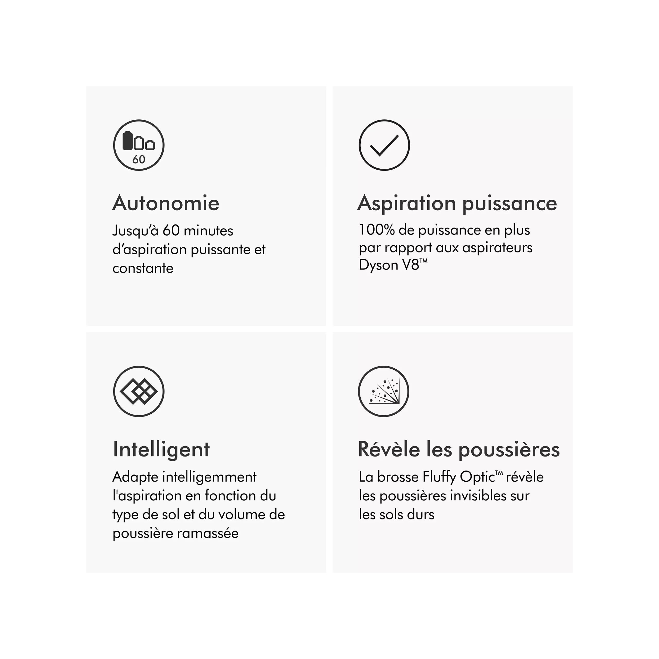 Puissance d’aspiration maximale : 240 Airwatts (variable selon type de sol et mode : standard, éco, boost).