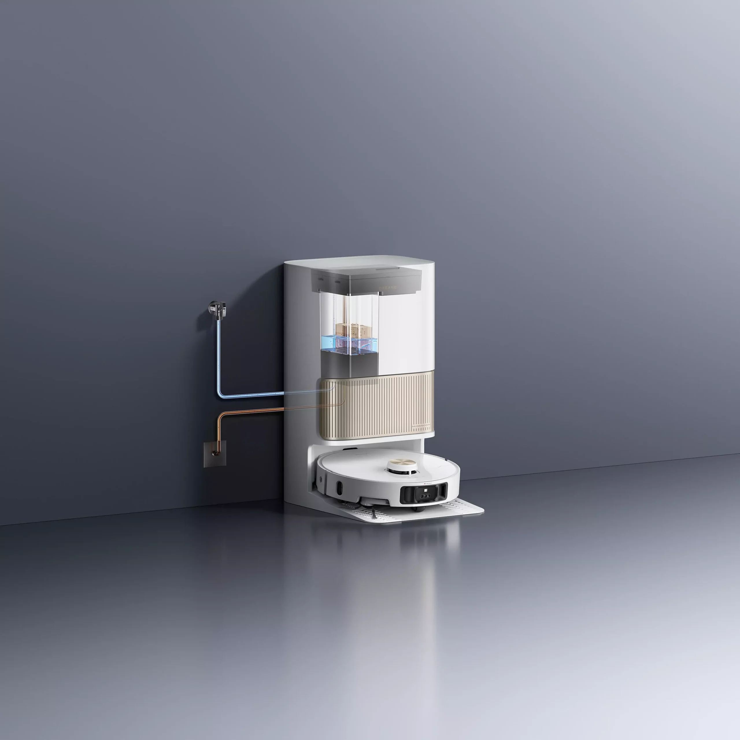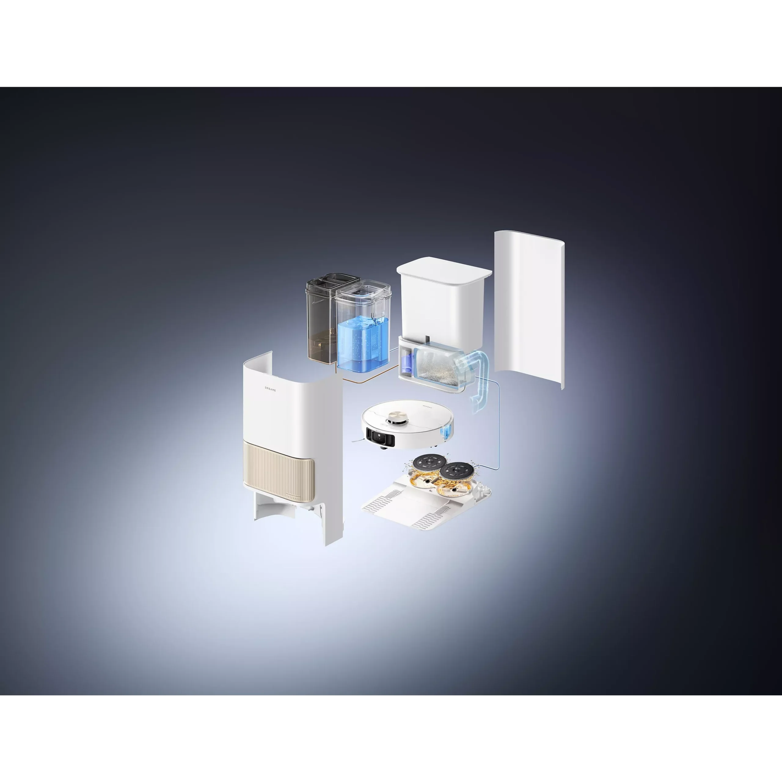 Station automatique : vidage de l’eau sale, remplissage du réservoir d’eau propre, auto-nettoyage et séchage des serpillières.