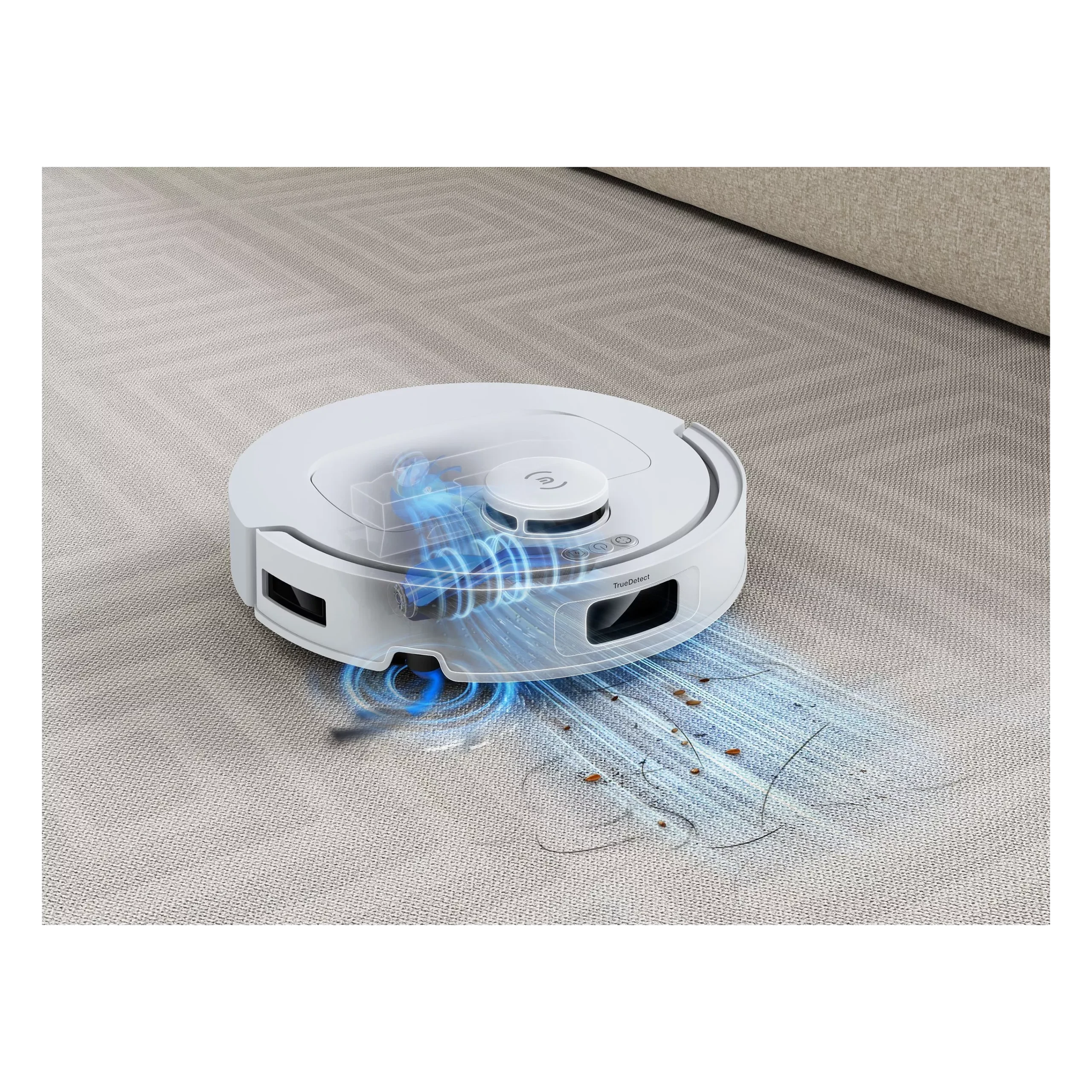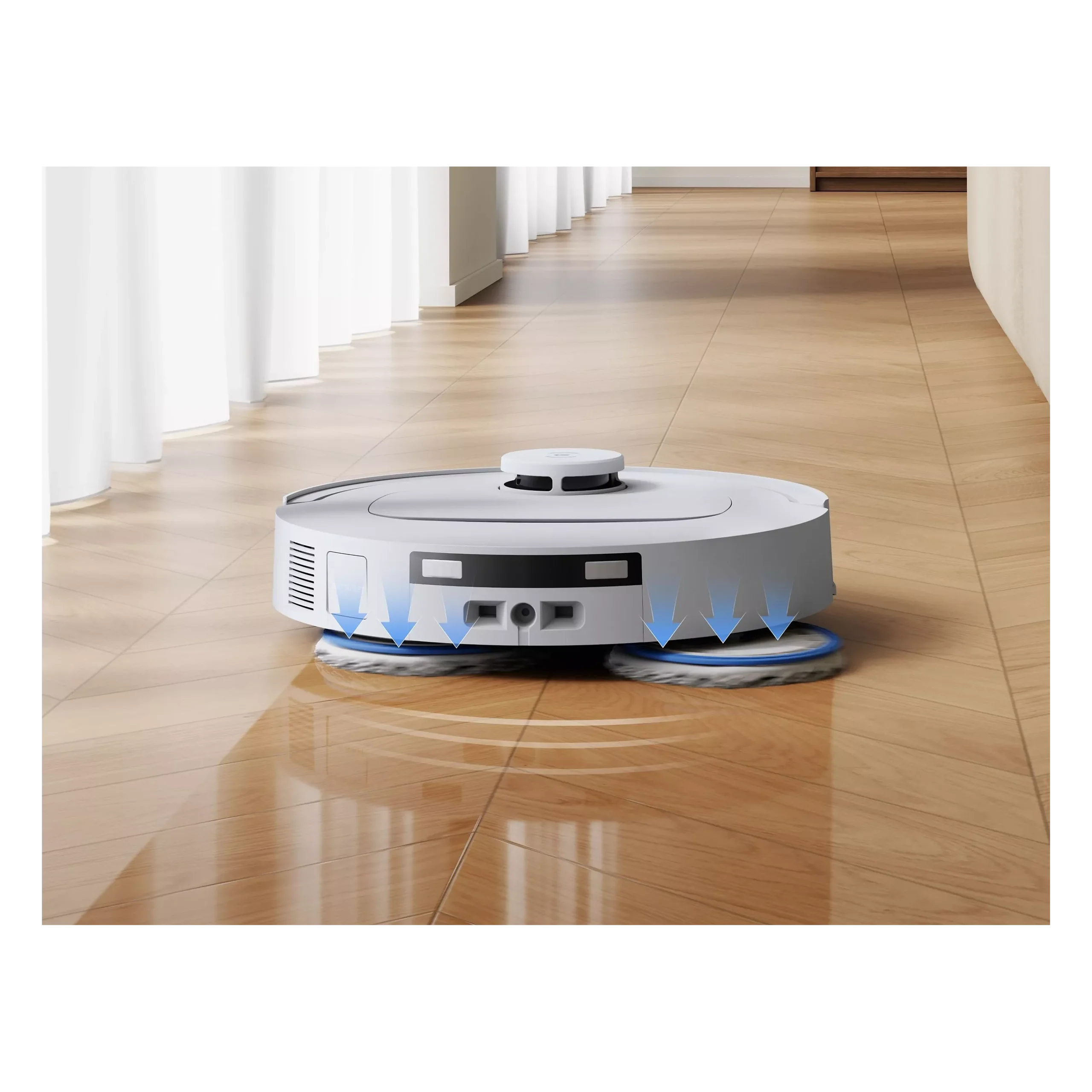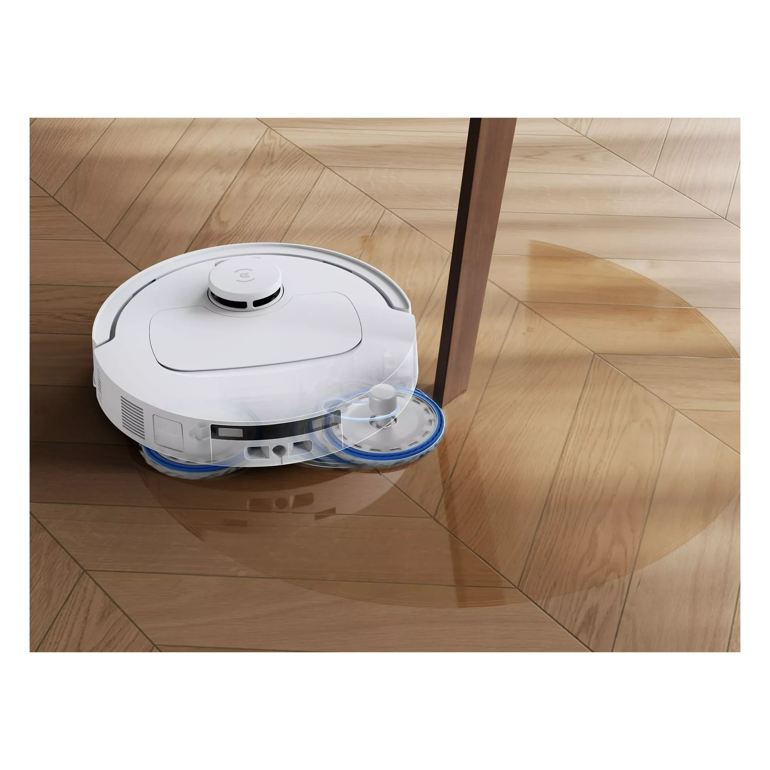 Le robot combine aspiration et lavage en un seul passage pour un nettoyage complet.