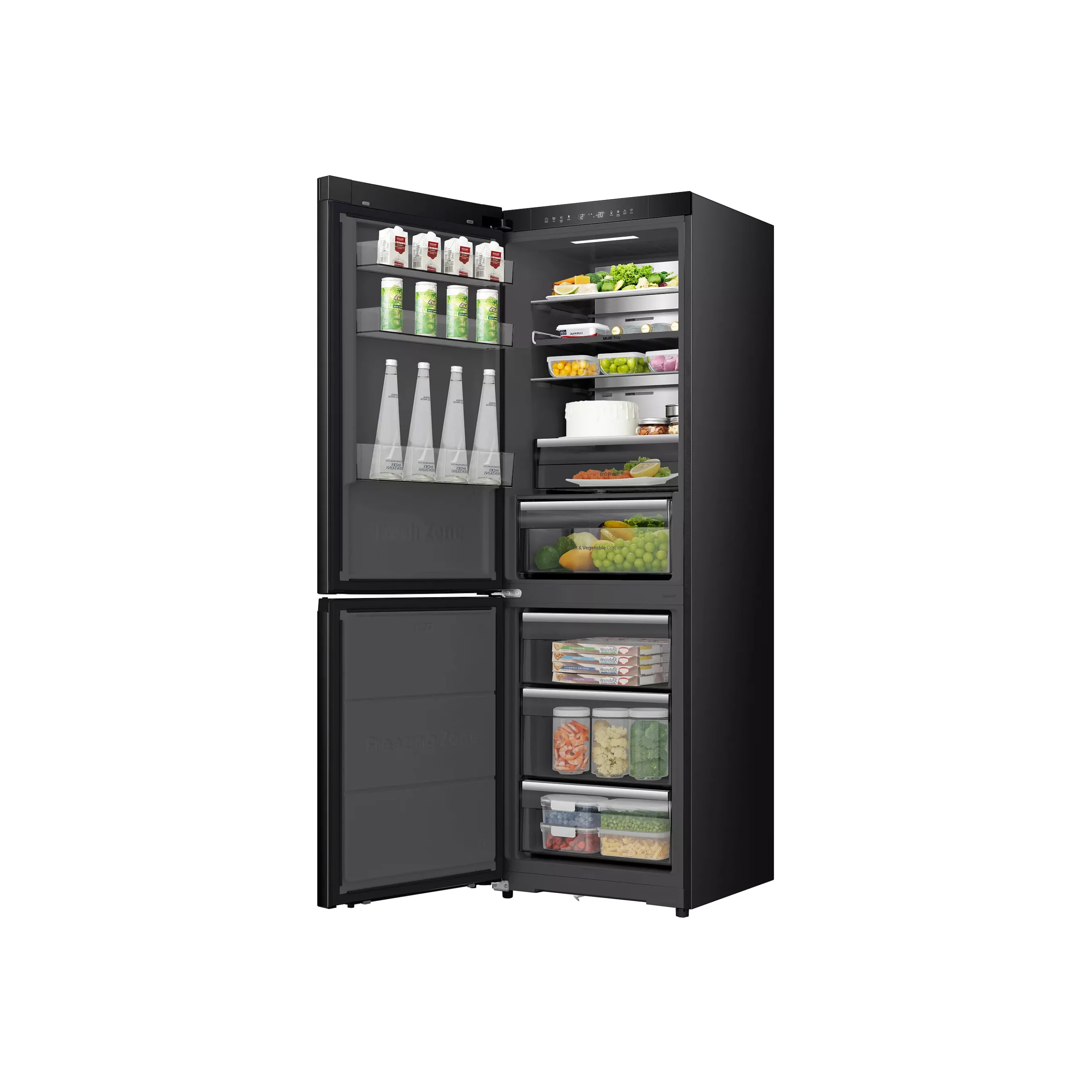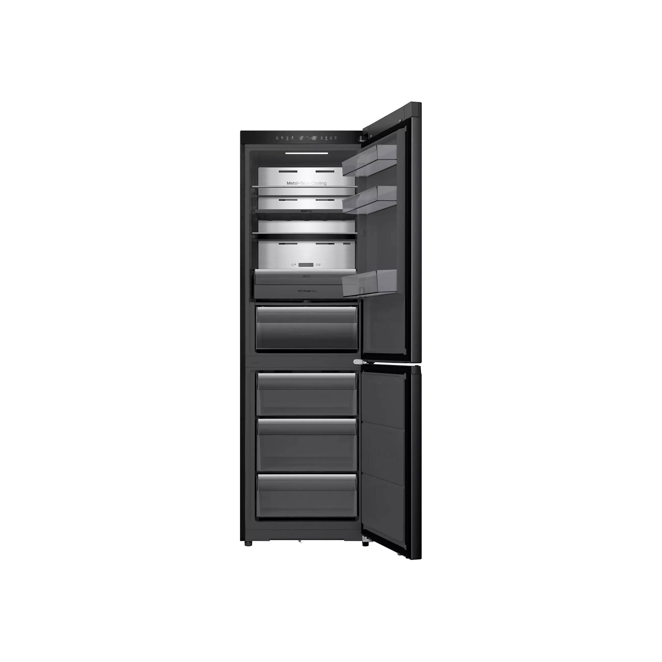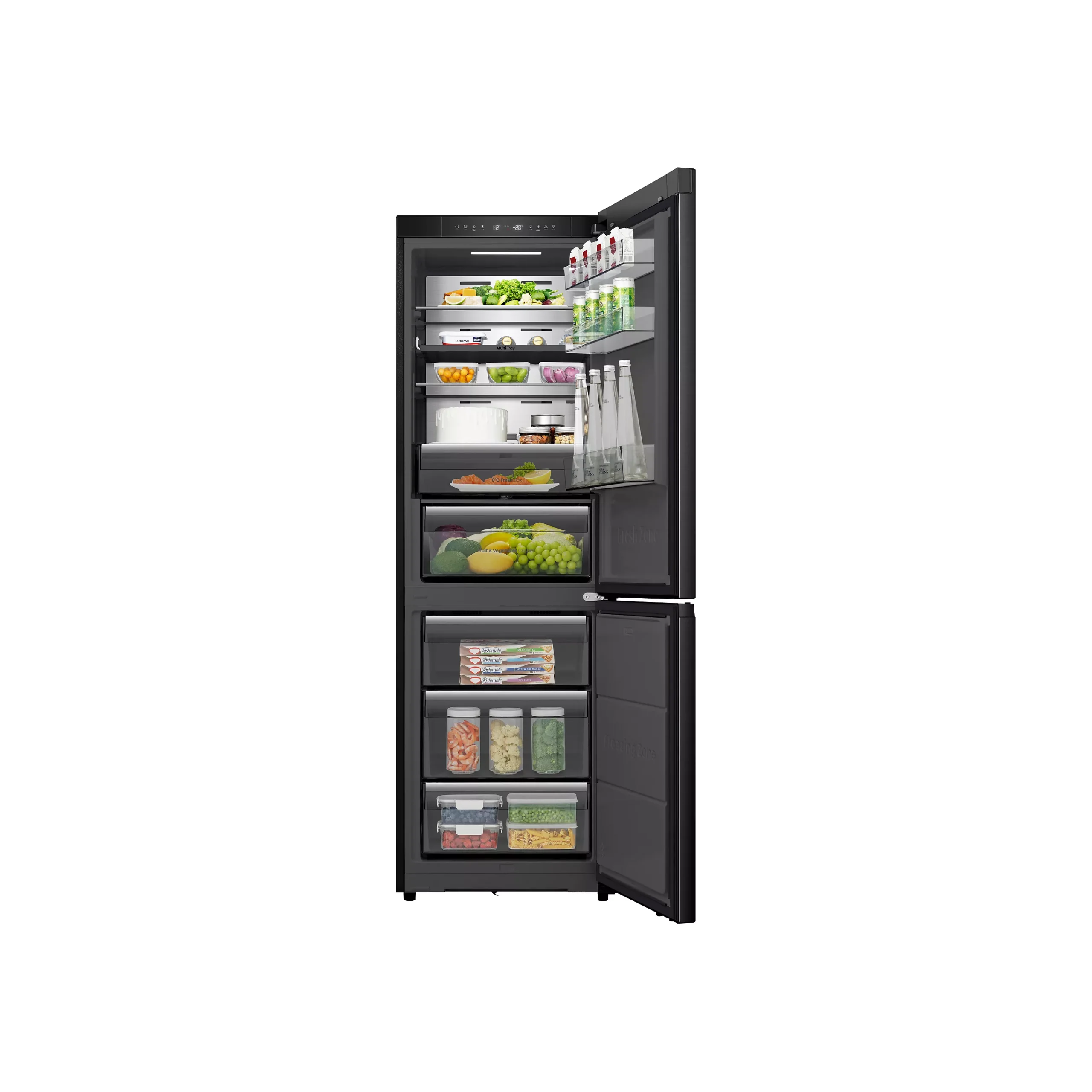 Ce réfrigérateur combiné de 330 L allie design élégant noir inox, silence remarquable (35 dB) et technologies avancées pour une conservation optimale des aliments au quotidien.