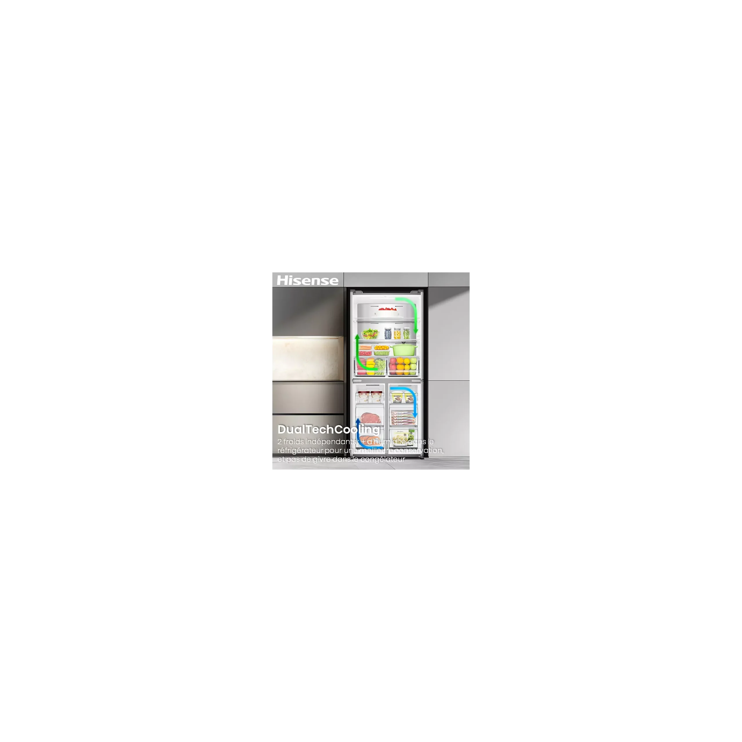 • Dual Tech Cooling : deux circuits de refroidissement indépendants pour éviter le mélange des odeurs et maintenir une humidité optimale